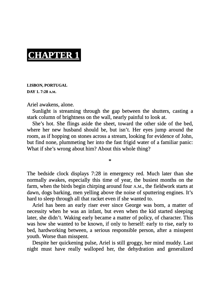 She starts with hotel security, then the police, then the American embassy, at each confronting questions she can’t fully answer: What exactly is John doing in Lisbon? Why would he drag her along on his business trip? Who would want to harm him? And why does Ariel know so little about her new—much younger—husband?