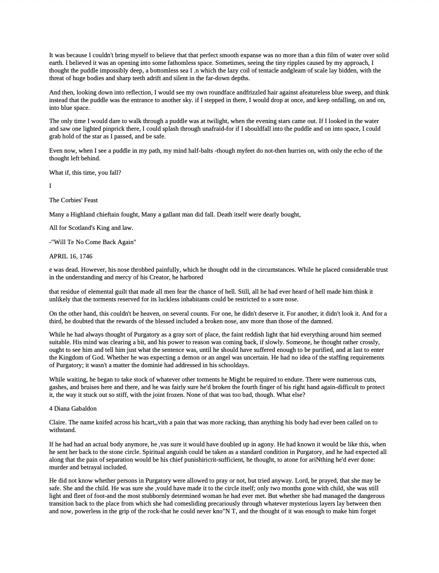 Jamie Fraser is, alas, not dead—but he is in hell. Waking among the fallen on Culloden Field, he is concerned neither for his men nor his wounds but for his wife and their unborn child. Lord, he prayed passionately, that she may be safe. She and the child. It’s a prayer he’ll utter many times over the next twenty years, never knowing but always hoping that Claire made it through the standing stones, back to the safety of her own time.
