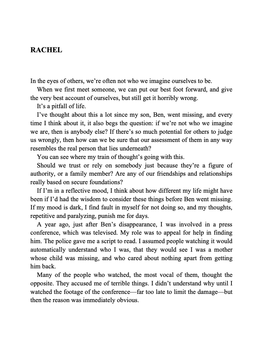 Police are called, search parties go out, and Rachel, already insecure after her recent divorce, feels herself coming undone. As hours and then days pass without a sign of Ben, everyone who knew him is called into question, from Rachel’s newly married ex-husband to her mother-of-the-year sister. Inevitably, media attention focuses on Rachel too, and the public’s attitude toward her begins to shift from sympathy to suspicion.