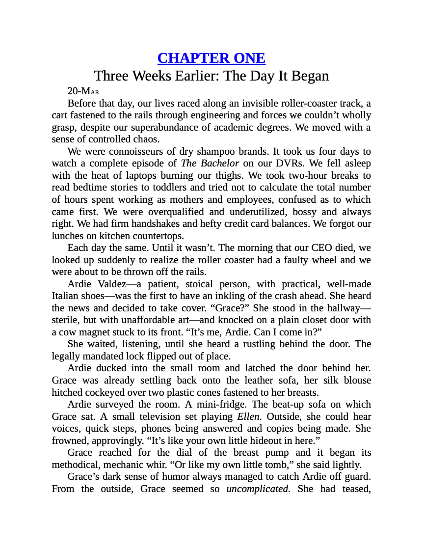 Sloane and her colleagues’ decision to take a stand sets in motion a catastrophic shift in the office. Lies will be uncovered. Secrets will be exposed. And not everyone will survive. All of their lives—as women, colleagues, mothers, wives, friends, even adversaries—will change dramatically as a result.
