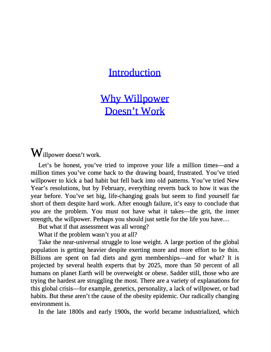 The world around us is fast-paced, confusing, and full of distractions. It's easy to lose focus on what you want to achieve, and your willpower won't last long if your environment is in conflict with your goals--eventually, the environment will win out. Willpower Doesn't Work is the needed guided for today's over-stimulating and addicting environment. Willpower Doesn't Work will specifically teach you: