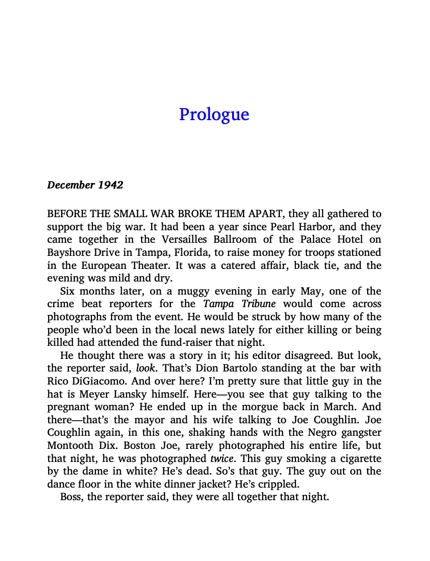 Ten years have passed since Joe Coughlin’s enemies killed his wife and destroyed his empire, and much has changed. Prohibition is dead, the world is at war again, and Joe’s son, Tomás, is growing up. Now, the former crime kingpin works as a consigliore to the Bartolo crime family, traveling between Tampa and Cuba, his wife’s homeland.