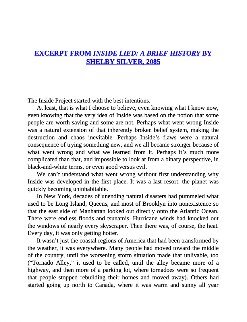 The year is 2050. Ava and her girlfriend live in what's left of Brooklyn, and though they love each other, it's hard to find happiness while the effects of climate change rapidly eclipse their world. Soon, it won't be safe outside at all. The only people guaranteed survival are the ones whose applications are accepted to The Inside Project, a series of weather-safe, city-sized structures around the world.